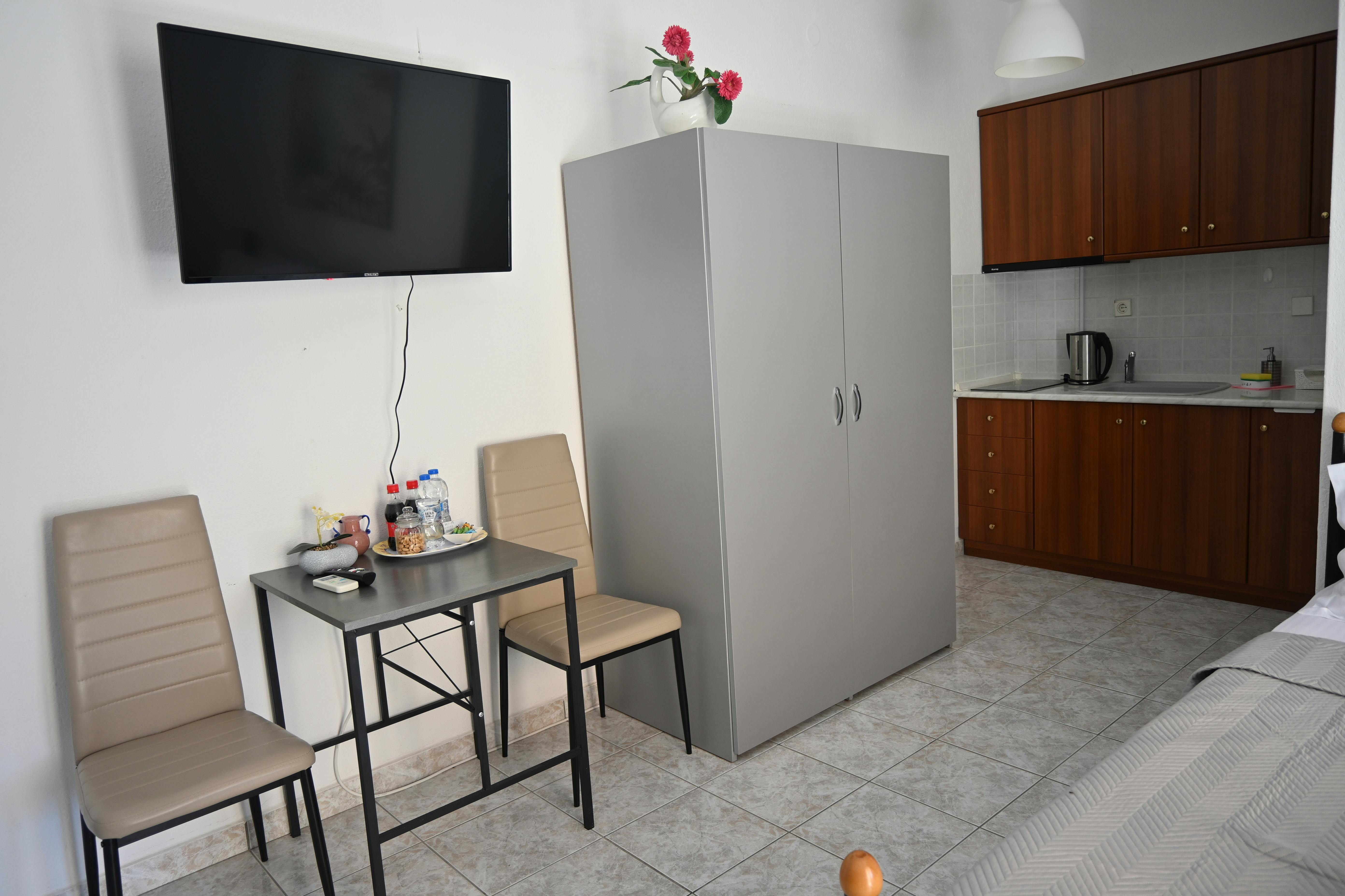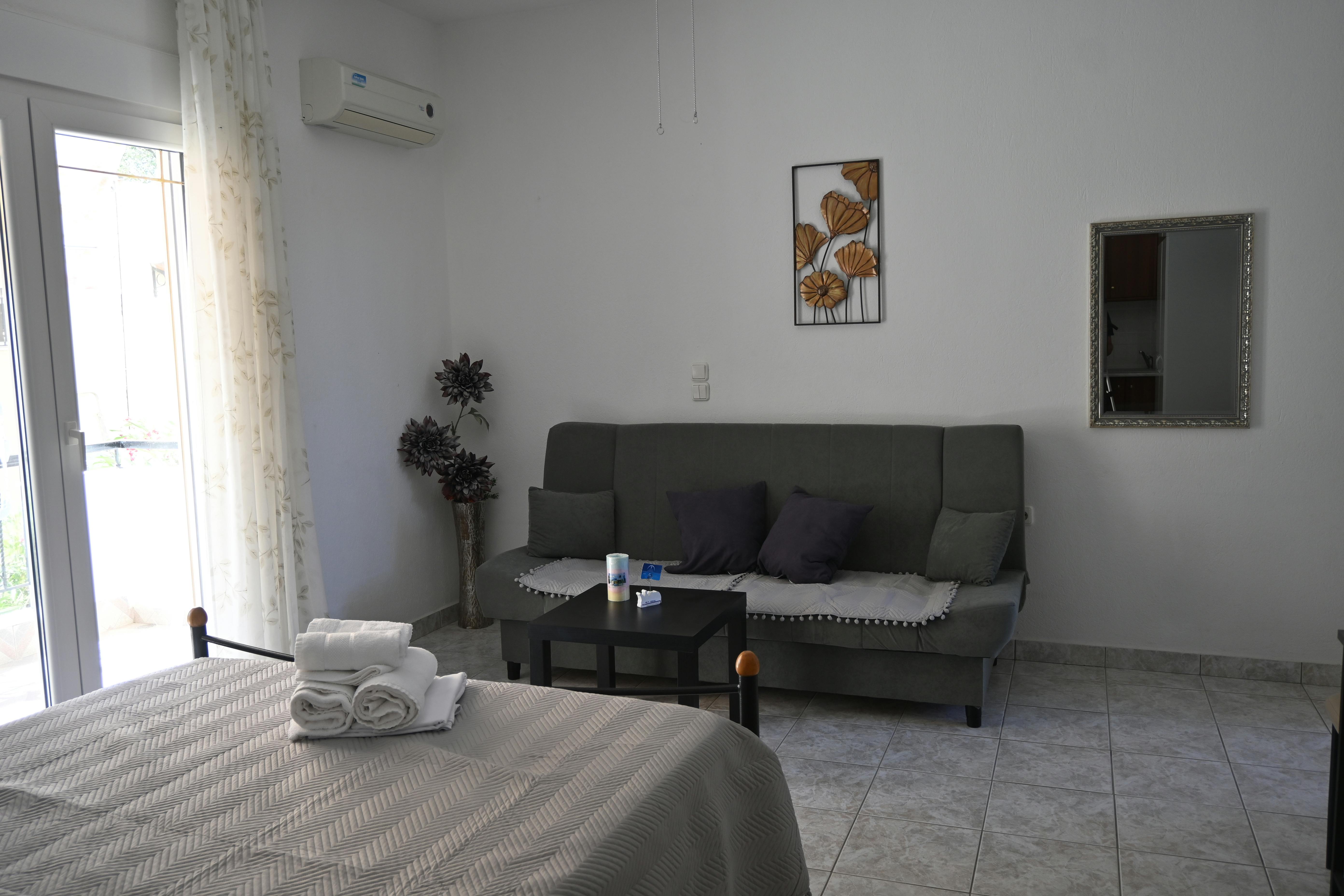 Our studios have a fully equipped kitchen that includes kitchenware, a fridge, a stove, and a Nespresso coffee maker. The rooms are furnished with comfortable extensible sofas that can fit both children and adults, making them ideal for families with young children.